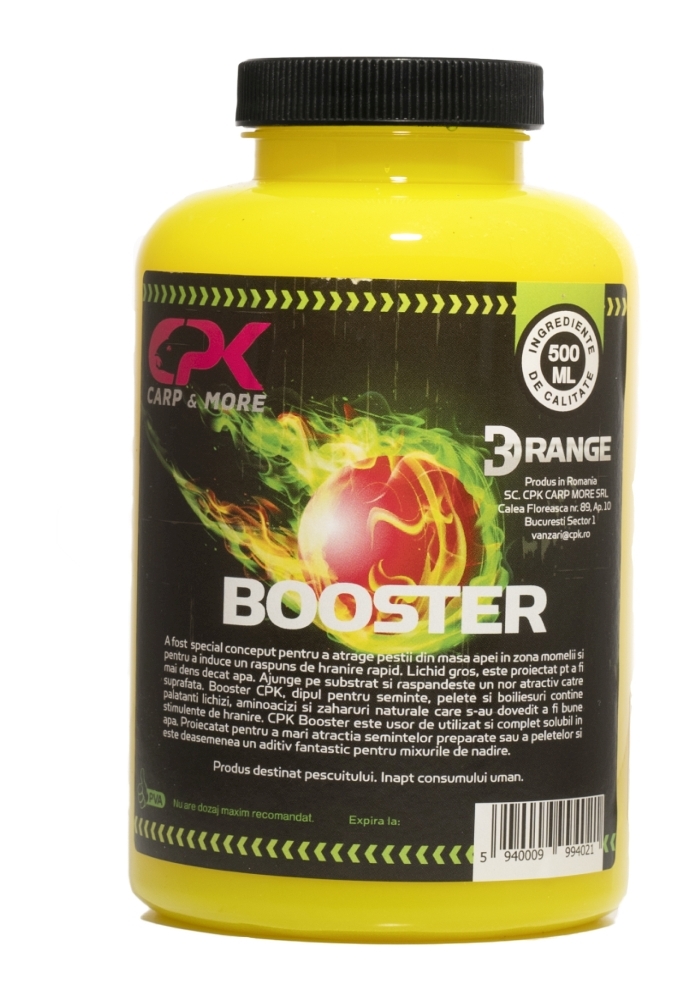 Booster CPK, dipul pentru seminte, pelete si boiliesuri contine palatanti lichizi, aminoacizi si zaharuri naturale care s-au dovedit a fi bune stimulente de hranire. CPK Booster este usor de utilizat si complet solubil in apa. Mareste atractia semintelor preparate sau a peletelor, si este de asemenea un aditiv fantastic pentru mixurile de nadire.