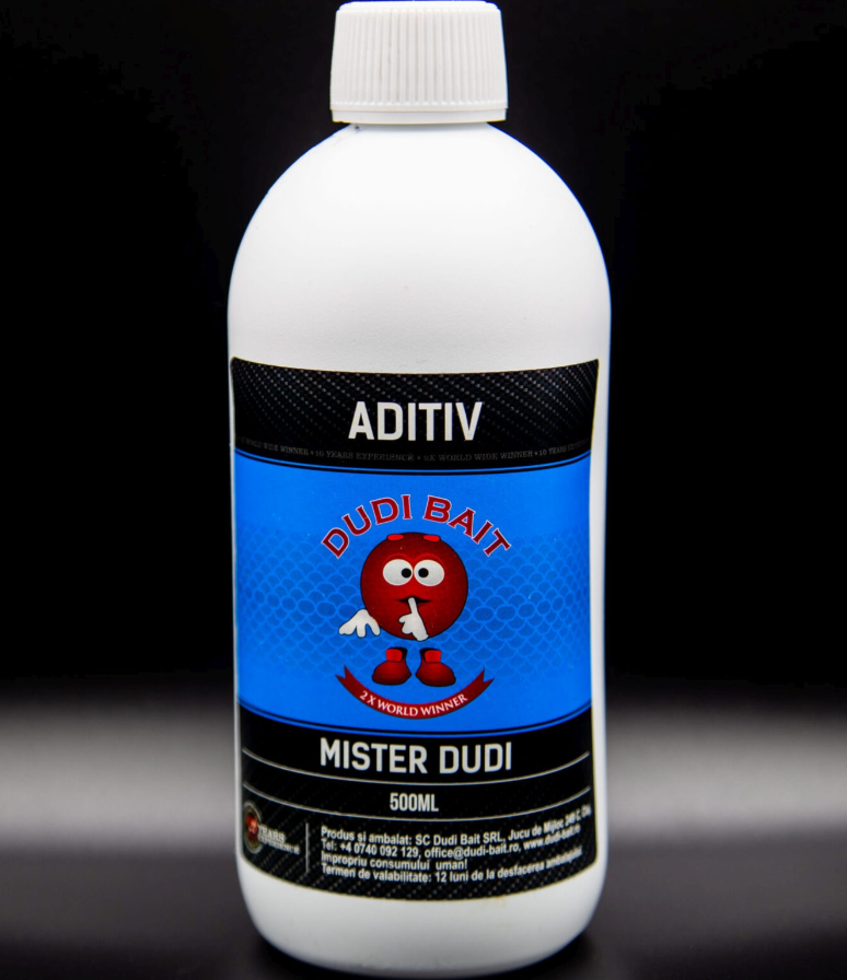 Aditivul Mister Dudi, este un aditiv lichid foarte concentrat si aromat, de aceea este obligatorie diluarea acestuia, cand se foloseste la umectarea nadei. Un amestec foarte bun este de 1/3 aditiv "Mister Dudi", 1/3 lichid pentru boilies-uri solubile si 1/3 apa din balta. Poate fi folosit in orice tip de groundbait, insa eficacitatea acestuia este sporita in combinatie cu nada "Mister Dudi", aditivul continand lichidele ce intra in compozitia boiliesurilor "Mister Dudi".