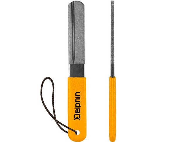 Un instrument esential cu lungime medie, care permite o ascutire rapida si eficienta. Canalele in forma V sunt recomandate pentru carlige cu varful drept, in timp ce partea plata este utila pentru carligele cu varf curbat. Ascutitorul din gama Delphin dispune de un maner de cauciuc care asigura o prindere ferma, anti-derapanta si un snur de prindere pentru incheietura.