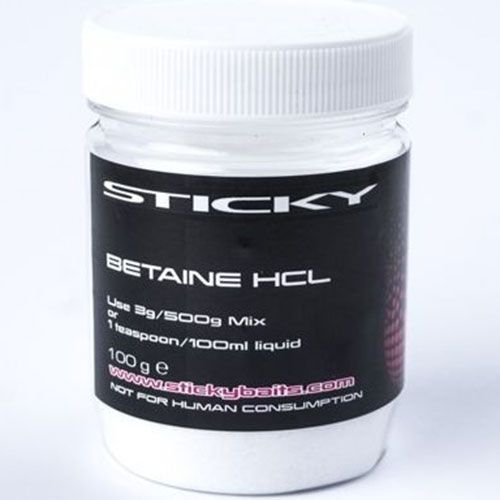 Betaina HCL are multe roluri in corpul pestelui, dar in mod special acela de a descompune proteinele si grasimile in stomac. Acesta este un constituent esential pentru digestie, in special pentru asimilarea vitaminei B12, Fier si Calciu. Asupra organismului pestelui, Betaina HCL prezinta efecte lipotrope si antioxidante. In ficat, ea intensifica productia de lecitina si contribuie la eliminarea toxinelor. Toate acestea nu fac altceva decat sa determine crapii sa caute prezenta Betainei in hrana de zi cu zi. Betaina HCL poate fi introdusa in mix sau dizolvata in partea lichida a boiliesului intr-un dozaj de 20-30gr/kgmix.