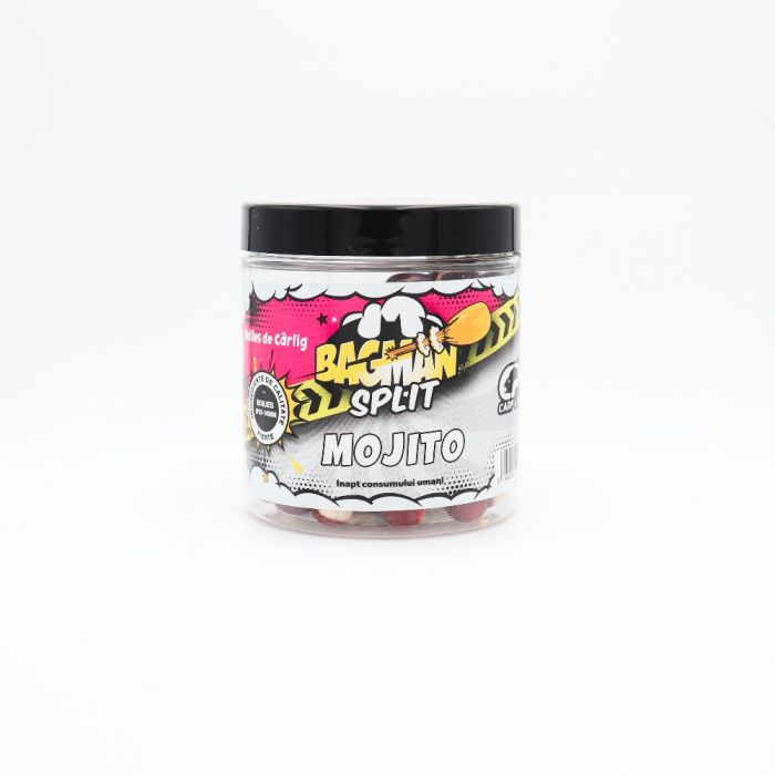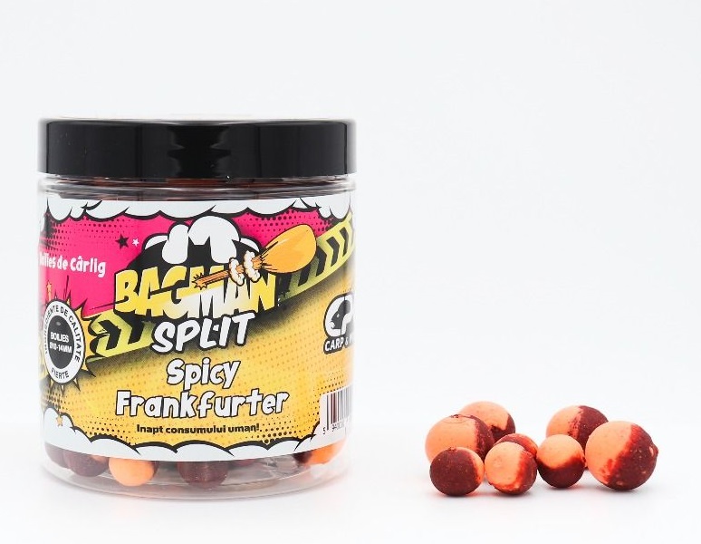 CPK Bagman Split combina mixul de boilies cu mixul de pop-up pentru avantajul unui boilies critic echilibrat - in doua tonuri de culoare - ce se va sustine pe substrat in greutatea carligului. Avantajele boiliesului de carlig Bagman Split sunt enorme: aduce acel plus mecanicii monturii prin anularea greutatii carligului si prin felul in care o momeala mai usoara zboara mai rapid in gura crapului, dar si prin acea atractie vizuala data de mixul colorat de pop-up. Sunt usor de folosit cu pungi PVA, dar pot fi folosite ca atare pe firul de par atunci cand avem nevoie in diferite situatii de momeli mai mici.