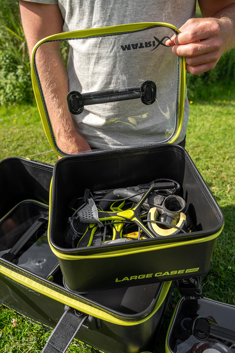 Matrix Large EVA Case 250 este o borseta perfecta pentru depozitarea penarelor mari destinate monturilor de pescuit. Aceasta borseta este realizata din material EVA rezistent la uzura, cu cusaturi sudate termic pentru durabilitate sporita. Dispune de un maner turnat pentru transport convenabil si un capac transparent din PVC, care permite o vizualizare rapida a continutului.
