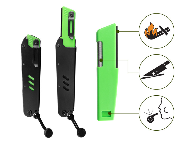 - Modul detasabil cu pila, amnar si fluier: Corpul cutitului contine un modul detasabil extrem de util. Pila este ideala pentru ascutirea cutitelor sau a carligelor, amnarul permite aprinderea focului chiar si fara bricheta (folosind lama impreuna cu amnarul), iar fluierul poate fi utilizat in situatii de urgenta sau pentru a alunga animalele.