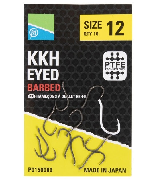 Preston KKH Eyed Barbed este proiectat dupa varianta populara KKM-B, cu un design agresiv proiectat pentru a oferi o intepare ferma. Acest carlig dispune de caracteristici importante ce ofera un real avantaj fata de alte modele de carlige "barbed" (cu spin). Ochetul orientat catre exterior creeaza un unghi unic, pentru o prezentare corecta si capacitate sporita de intepare. Carligele sunt fabricate din otel carbon japonez, au un strat acoperitor PTFE (strat ce scade semnificativ vizibilitatea carligului, reducand sansele de a speria pestele), iar varful ascutit cu o tehnologie speciala le confera o durata de viata indelungata.