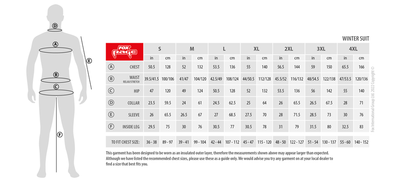 Noul costum de iarna ce reprezinta o versiune imbunatatita a modelului popular Fox Rage Winter Suit, va asigura mereu protectie impotriva frigului si a intemperiilor. Este compus din doua piese distincte: geaca si salopeta, ambele avand factor de impermeabilitate 5000mm si un coeficient de respirabilitate de 3000 g/m². Atat jacheta cat si salopeta sunt captusite cu fleece pentru izolare termica excelenta, oferind in acelasi timp libertate totala de miscare (chiar si in timp ce stati asezat pe scaun) in timpul partidelor de pescuit.