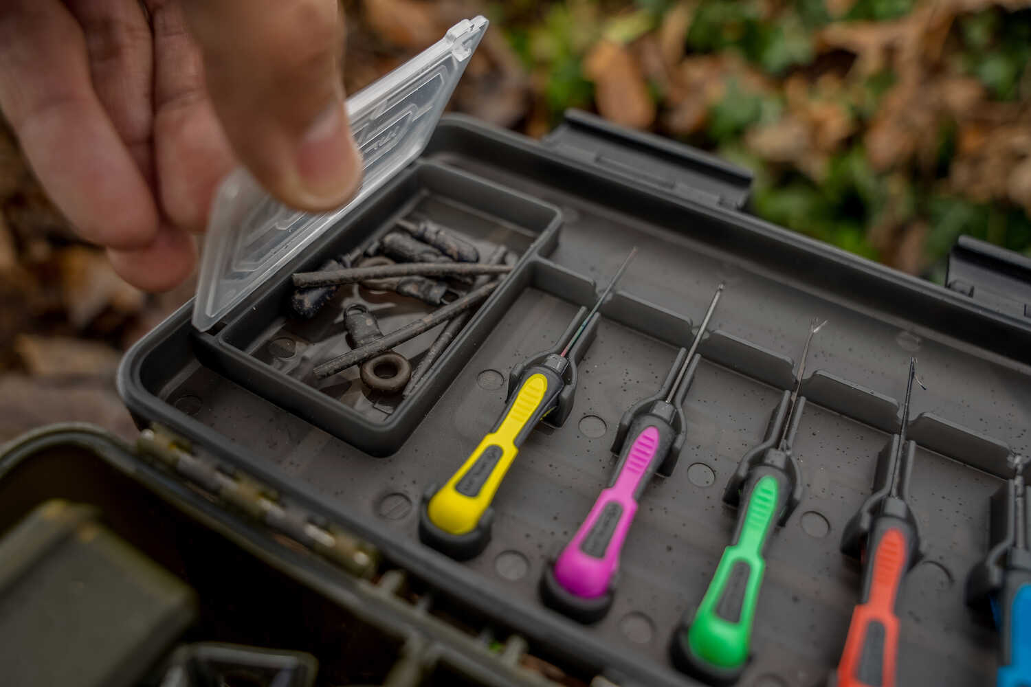 Capacul interior include patru compartimente dedicate pentru accesorii mici – cum ar fi agrafe, varteje, opritoare sau carlige – si suporturi special concepute pentru foarfeca, crosete si burghie. Acest design asigura acces rapid la toate uneltele esentiale in timpul monturii. Setul este livrat complet echipat cu uneltele de baza, astfel incat pescarul este pregatit de actiune imediat.