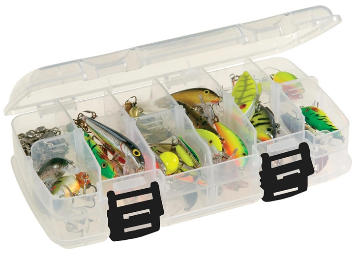 Plano Adjustable Double-Sided Stowaway este o cutie dubla fabricata din plastic rezistent la actiunea coroziva a apei, recomandata pentru depozitarea nalucilor si accesoriilor de spinning. Dimensiunile cutiei sunt generoase (21x11x6cm), putand stoca un numar mare de naluci. Locasurile speciale dispun de caneluri speciale, ce permit pozitionarea nalucilor in siguranta. Cutia dispune de sistem de inchidere etans, prevazut cu clapete din plastic rigid, foarte rezistent la manipulari repetate. Cutia protejeaza eficient interiorul impotriva socurilor mecanice si a umezelii. Plasticul transparent permite identificarea rapida a continutului cutiei.Naluciile din imagine nu sunt incluse ,au scop de exemplificare.
