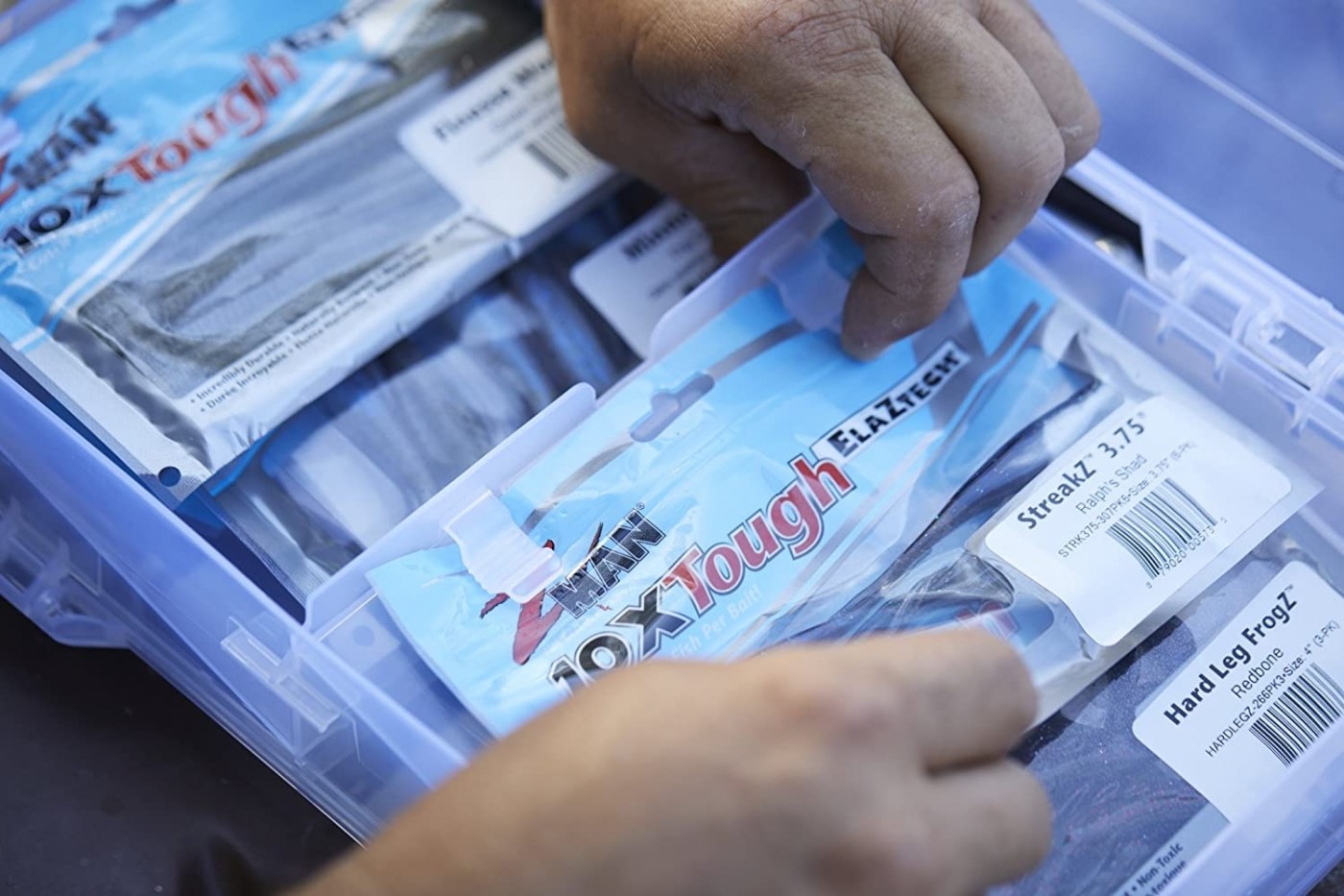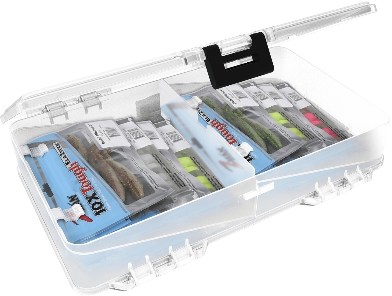 Plano Double-Sided Stowaway 371610 este o cutie dubla fabricata din plastic rezistent la actiunea coroziva a apei, recomandata pentru depozitarea plicurilor cu naluci moi. Cutia are cate 2 compartimente pe fiecare parte in care se afla clipsuri pentru fixarea plicurilor cu naluci moi. Dimensiunile cutiei sunt generoase, putand stoca 16 plicuri, cate 4 in fiecare compartiment. Cutia dispune de sistem de inchidere cu clapete din plastic rigid, foarte rezistente la manipulari repetate. Cutia protejeaza eficient interiorul impotriva socurilor mecanice si a umezelii. Plasticul transparent permite identificarea rapida a continutului cutiei.