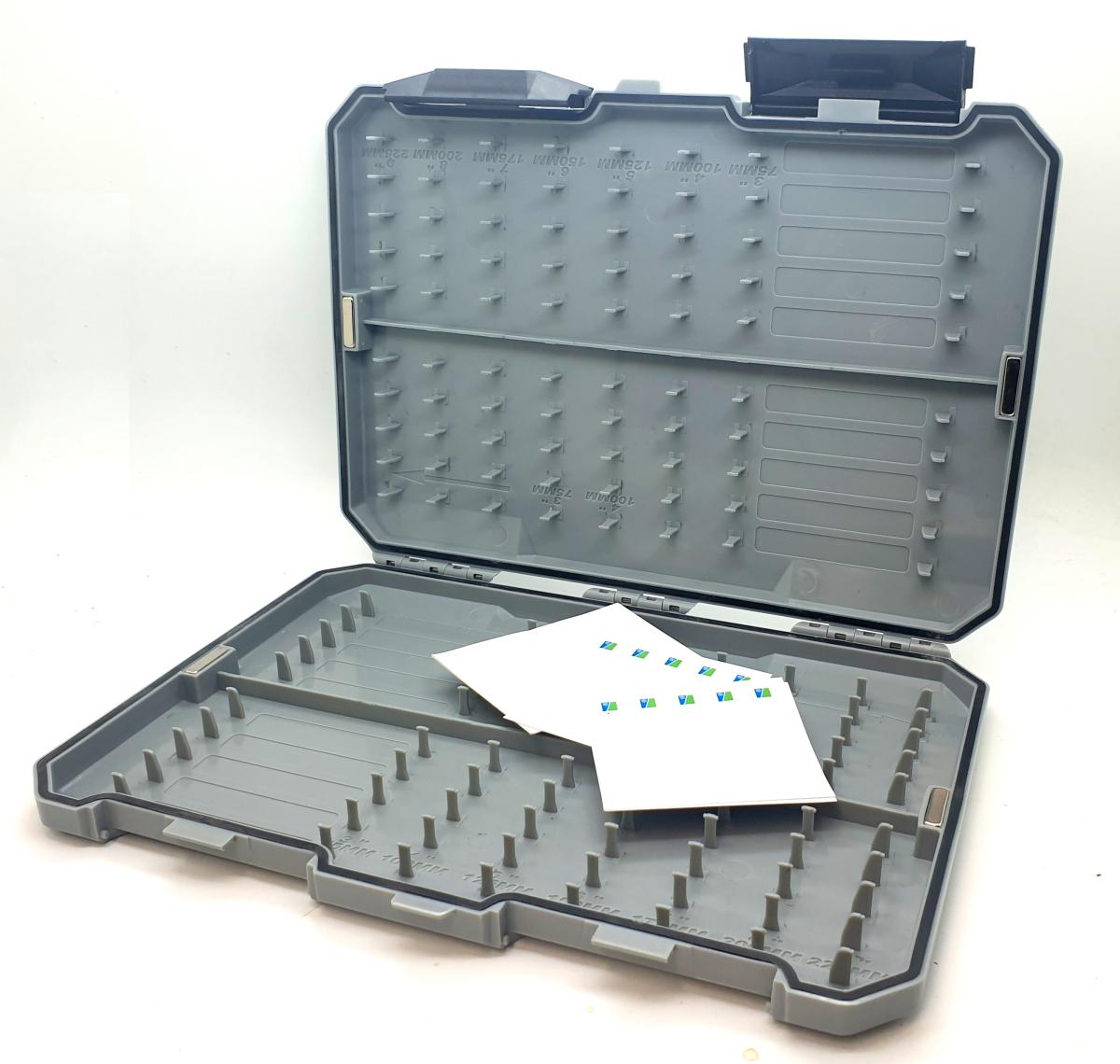 Acest penar universal este ideal pentru depozitarea a numeroase riguri cu lungimi cuprinse intre 7.5cm si 22.5cm. Capacitatea este enorma, deoarece penarul este echipat cu pini fixi ce pot sustine fiecare cate 20 de riguri. Asadar, penarul poate stoca un total de pana la 800 riguri de 7.5cm sau 10cm si un total de pana la 400 de riguri mai lungi de pana la 22.5cm. Interiorul penarului este prevazut cu gradatii (in milimetri), fiind de un real ajutor in situatiile cand doriti sa legati monturile la dimensiunea dorita.