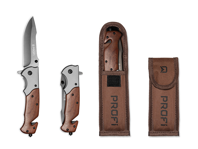 Delphin Profi este un cutit/briceag pliabil universal care poate fi folosit nu numai pentru pescuit, ci si pentru drumetii sau plimbari in natura. Manerul este realizat dintr-o combinatie de lemn si metal de inalta calitate. Cutitul este echipat cu o clema, ceea ce face ca acesta sa fie usor de atasat la curea sau in buzunar pentru a nu cadea. Lama are o lungime totala de 100 mm si este protejata impotriva indoirii pe timpul utilizarii. Lama are o forma de varf de sulita cu o muchie falsa in partea superioara. Cutitul PROFI dispune, de asemenea, de un taietor de cabluri, un taietor de franghii, dar si de un varf ascutit pentru spargerea sticlei. Pachetul include o husa practica din tesatura pentru a-l proteja, de exemplu, pentru a nu fi deteriorat in timpul transportului.
