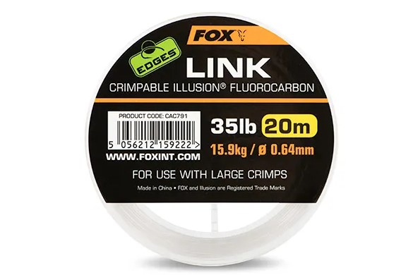 Edges Link Crimpable Illusion este un fir fluorocarbon special proiectat pentru a fi folosit cu bridele Edges Crimps, rezultatul final fiind monturi elegante si incredibil de rezistente. Firul este exceptional pentru legarea monturilor rigide precum Hinge Rig (montura articulata), Ronnie Rig si diversele modele de Combi Rig. Firul este disponibil in doua diametre compatibile cu bridele de marime corespunzatoare: varianta de 25lbs (0.53mm) poate fi folosita cu bridele Small Crimps, iar varianta de 35lbs (0.64mm) poate fi folosit cu bridele Medium Crimps.