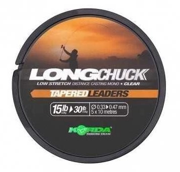 Shock leaderul Korda Longchuck a fost conceput special pentru pescuitul pe distante lungi fara riscul rupturilor si sunt perfecti atunci cand sunt utilizati impreuna cu firul principal LongChuck. Exista trei combinatii diferite de LongChuck Tapered Leader, permitand potrivirea cu rezistenta la r upere a firului principal utilizat. Acest lucru permite cel mai frumos nod de imbinare posibil si reduce riscul de rupturi. Fiecare leader are o lungime de 10 metri, avand 8 metri de fir de 0.47mm pentru a absorbi forta aruncata, precum si pentru a oferi protectie atunci cand sunteti in drill cu pestii, datorita rezistentii sale la abraziune. Ultimii 2 metri se reduc de la 0.47mm la 0.27mm, 0.30mm sau 0.33mm, in functie de versiunea aleasa. Firele conice prezinta aceleasi proprietati ca firul principal LongChuck, cu intindere ultra-redusa si greutate mica. Proprietatile sale asigura ca ramane in aer mai mult timp, iar un raport ridicat de rupere la diametru ajuta la reducerea rezistentei in aer. Fiecare rola contine cinci leaderi.