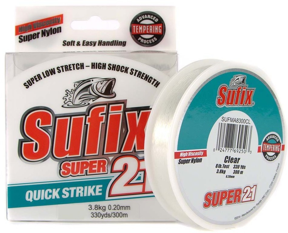 SUFIX Super 21 Low Stretch este un fir monofilament fabricat din fibre de polyester cu vascozitate mare. Datorita procesului de fabricatie avansat, s-a reusit creare unei linii monofilament ce are o elongatie de doar 21% - aproximativ jumatate din elongatia unui fir monofilament normal. Elongatia foarte scazuta combinata cu rezistenta superioara la rupere, ofera un control absolut asupra nalucii si o intepare rapida. Culoarea transparent ii confera firului un camuflaj perfect in coloana de apa, indicele de refractie aproape de "0" facandu-l practic invizibil, neputand fi detectat de catre pestii suspiciosi.