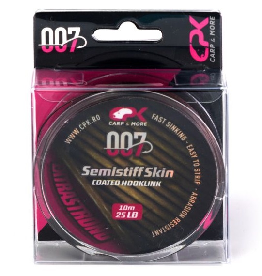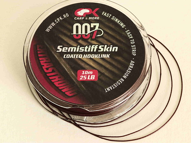 CPK Semistiff Skin Hooklink este un fir textil camasuit cu scufundare rapida si o rigiditate ce va asigura ca montura nu se va incurca in lansare. Este ideal pentru confectionarea monturilor Combi, camasa putand fii decojita cu ajutorul unui stripper. Culoarea maro asigura un camuflaj ideal pe substrat fara a da suspiciuni pestilor de talie mare care sunt extrem de precauti. Este un fir semirigid ce nu permite monturii sa se incurce, dar care ofera destula libertate momelii in momentul aspirarii de catre crap.