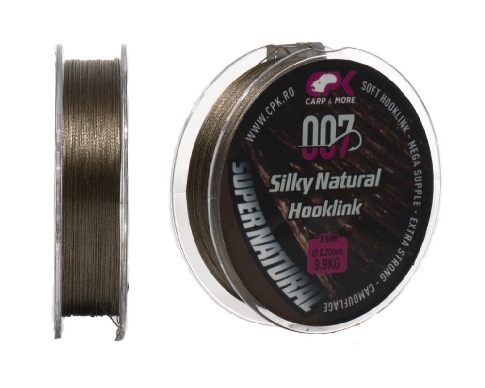 CPK Silky Natural Hooklink este un fir textil scufundator, cu o textura matasoasa. Desi are un diametru redus, impletitura rotunda il face un fir deosebit de rezistent la nod si la abraziune iar supletea si camuflajul vin sa il recomande ca fiind unul de buna calitate. Culoarea maro ii confera firului un camuflaj perfect pe substrat. Firul este fabricat cu ajutorul celor mai noi tehnologii in domeniu, firul are la baza recomandarile pescarilor cu mare experienta, pentru acoperirea mai multor situatii de pescuit.