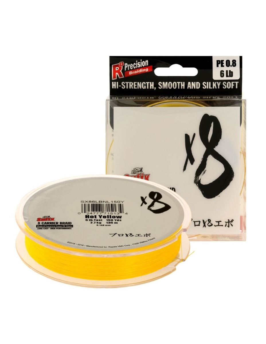 SUFIX Carrier Braid X8 este unul dintre cele mai puternice fire impletite de pe piata, avand o rezistenta remarcabila la tractiune dar in acelasi timp un diametru redus. Fabricat din 8 fibre PE impletite foarte strans (impiedica scamosarea firului) cu acoperire micro (reduce masiv pericolul formarii nodurilor din timpul lanseurilor), firul se mai remarca si prin urmatoarele caracteristici: diametrul rotund, rezistenta sporita la abraziune si elongatie nula (ceea ce permite o distanta de lansare apreciabila). Culoarea "Hot Yellow" ajuta la pescuitul pe timp de noapte, firul fiind vizibil chiar si in conditii de luminozitate mai slaba.
