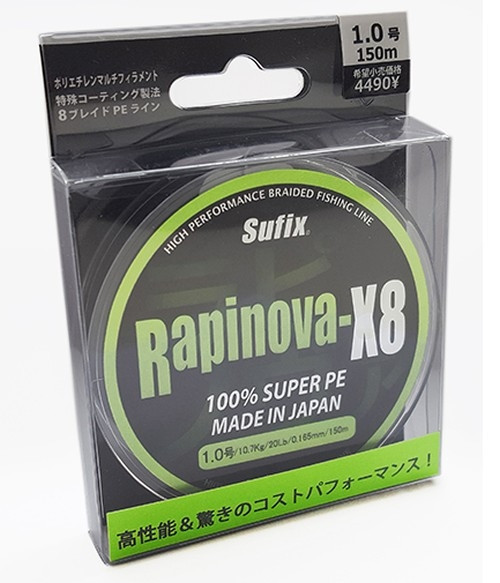 SUFIX Rapinova este unul dintre cele mai puternice fire impletite de pe piata, avand o rezistenta remarcabila la tractiune dar in acelasi timp un diametru redus. Fabricat din 8 fibre Dyneema impletite foarte strans (impiedica scamosarea firului) cu acoperire micro (reduce masiv pericolul formarii nodurilor din timpul lanseurilor), firul se mai remarca si prin urmatoarele caracteristici: diametrul constant, rezistenta sporita la abraziune si elongatie nula (ceea ce permite o distanta de lansare apreciabila). Culoarea lemon green ajuta la pescuitul pe timp de noapte, firul fiind vizibil chiar si in conditii de luminozitate mai slaba.