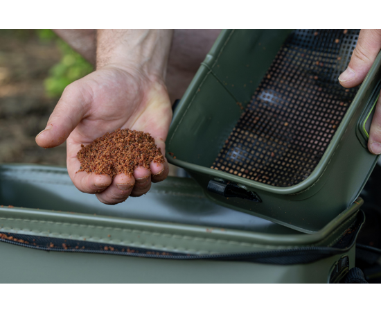 Geanta include doua tavite interioare, dintre care una prevazuta cu sita de 3mm pentru sitarea nadelor vii sau a groundbaiturilor. Tavitele pot fi fixate pe exteriorul gentii in timpul utilizarii, transformand-o intr-o statie de nadire practica si organizata.
