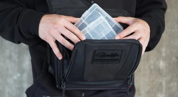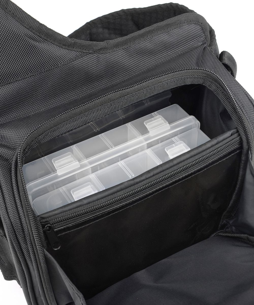 Geanta practica, foarte usoara, utila in transportul si organizarea tuturor accesoriilor esentiale in desfasurarea unui pescuit de calitate. Super accesorizata, cu diverse compartimente pentru naluci ce evita incurcarea acestora este ideala pentru pescarii de rapitor. Este confectionata din polyester si captusita in intregime pentru protectia perfecta a tuturor accesoriilor importante. Este echipata cu doua cutii pentru naluci cu dimensiunile 20x13x4cm.