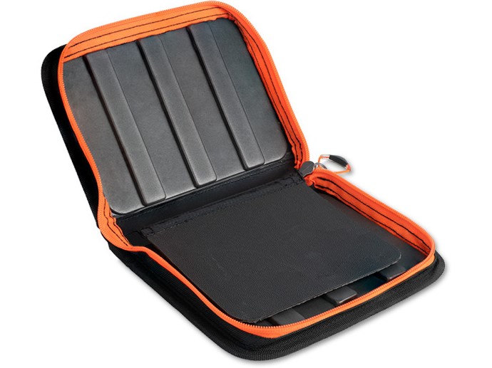Fermoarul exterior de înaltă calitate este de culoare portocalie și este atașat la un mâner din plastic pentru o mai bună manipulare, care este lărgit la capăt pentru o prindere ușoară și rapidă. Accentele portocalii de pe carcasă permit pescarului să o recunoască rapid, chiar și în condiții de lumină slabă, în timpul ieșirilor de dimineață devreme sau seara târziu. Designul carcasei este completat de modelul nostru unic de camuflaj întunecat ATAK! cu siluete de pești prădători.