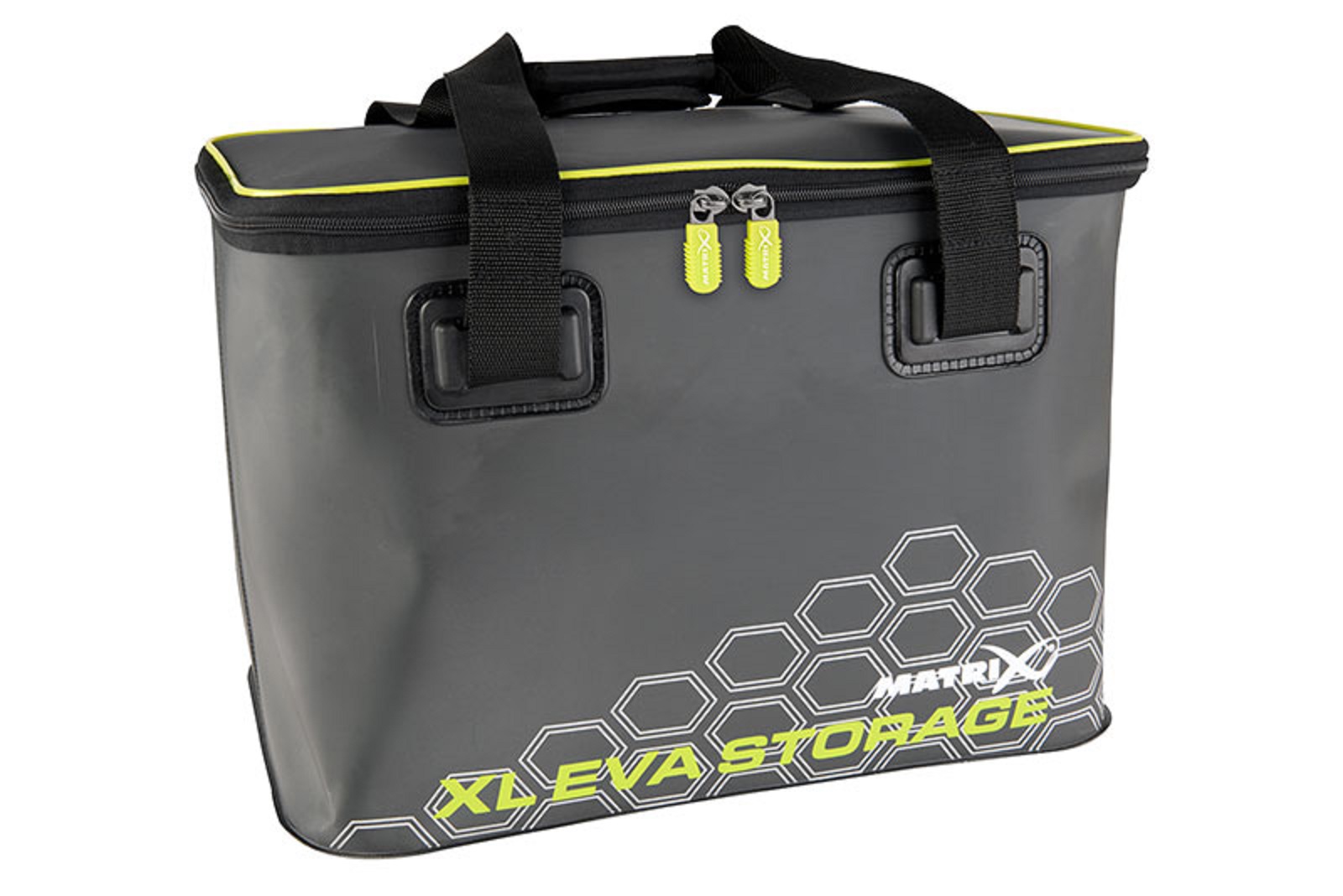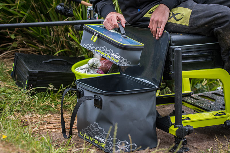 Matrix XL EVA este o geanta universala din plastic pentru pescari, de forma dreptunghiulara care serveste la pastrarea diferitor dotari pescaresti. Este confectionata din material EVA dur si isi pastreaza foarte bine forma. Geanta este de culoare gri mat si este echipata cu un fermoar care se inchide capacul. Pe capac si pe buzunarul frontal se gaseste o bordura de culoare verde deschisa. Partea inferioara este confectionata din plastic impermeabil si in cazul in care ceva se varsa in interior, acest lichid va fi retinut de partea inferioara a gentii. De asemenea, daca asezati geanta pe o suprafata umeda, aceasta nu se umezeste, poate fi spalata atat pe interior cat si pe exterior.