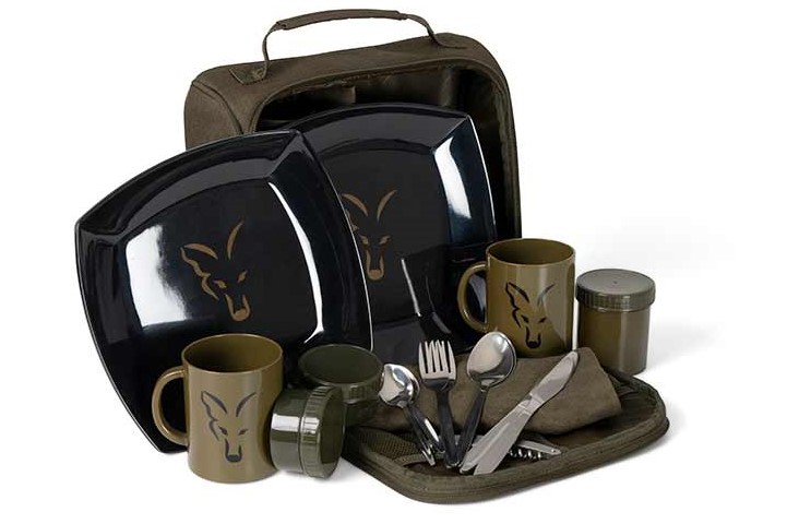 Fox Voyager 2 Person Dinner Set este o geanta pentru picnic, ideala pentru doua persoane, ce include toate accesoriile necesare pentru o masa in natura. Setul contine 2 cutite, furculite, linguri si lingurite din otel inoxidabil, 2 farfurii negre patrate, 2 cani din ceramica in model Khaki Camo, un tirbuson, un recipient mare cu capac filetat, 2 recipiente mici cu capac si un prosop din microfleece.