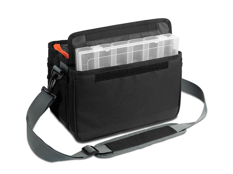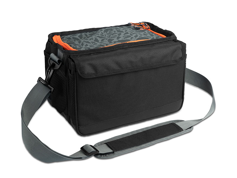 Spațiul din interior este organizat în așa fel încât să fie ușor accesibil chiar și atunci când o purtați în timpul pescuitului. De aceea, are un sistem de acces care poate fi deschis în fața pieptului. Spațiul din interior poate fi despărțit de un separator cu velcro ajustabil. Ambele părți au un buzunar divizat cu plasă pentru a vă depozita micile accesorii. În spate există un buzunar cu fermoar velcro și o cutie de plastic cu separatoare detașabile. Cutia vine împreună cu geanta. Un alt buzunar cu fermoar se află în partea din față a genții și îl puteți folosi pentru a vă depozita forcepsul sau un permis de pescuit.