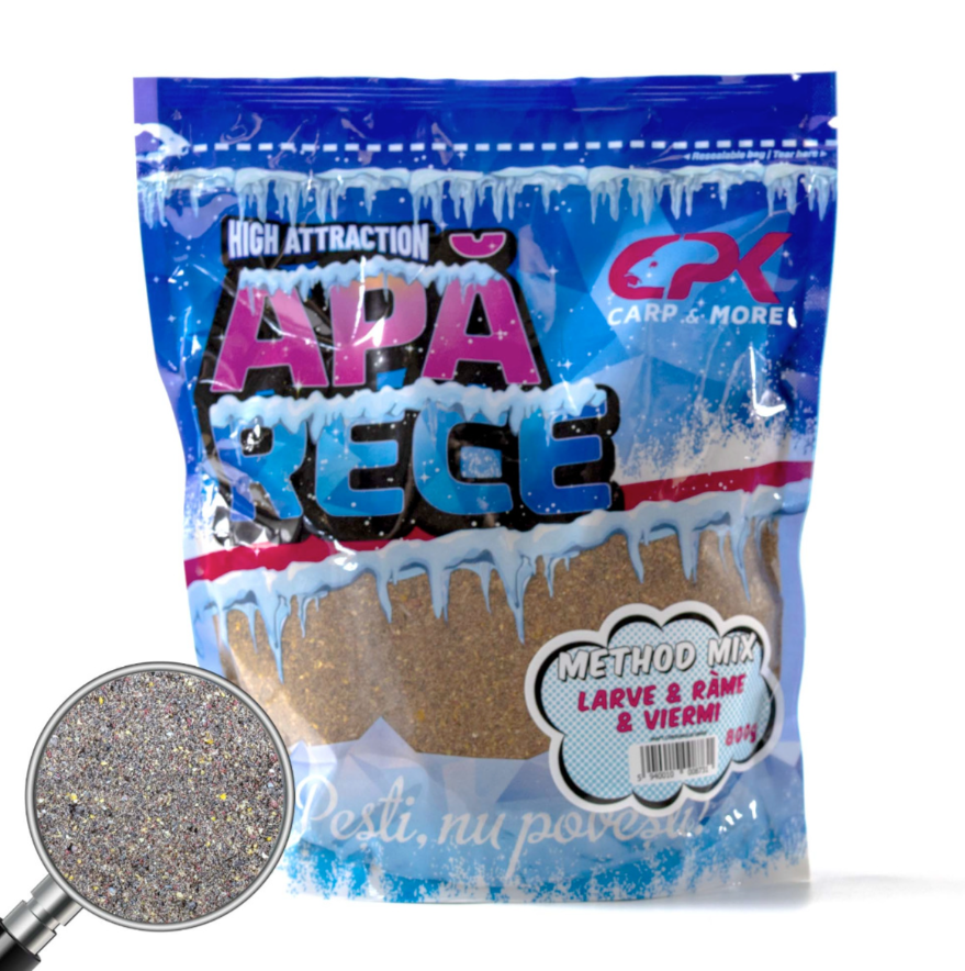 CPK Apa Rece Method Mix 800g este o nada special conceputa pentru partidele de pescuit in sezonul rece, atunci cand activitatea pestilor este redusa si atractia trebuie sa fie instantanee. Mixul contine ingrediente solubile, faina de peste de calitate, betaina si atractanti naturali, care se activeaza rapid chiar si in apa cu temperatura scazuta.