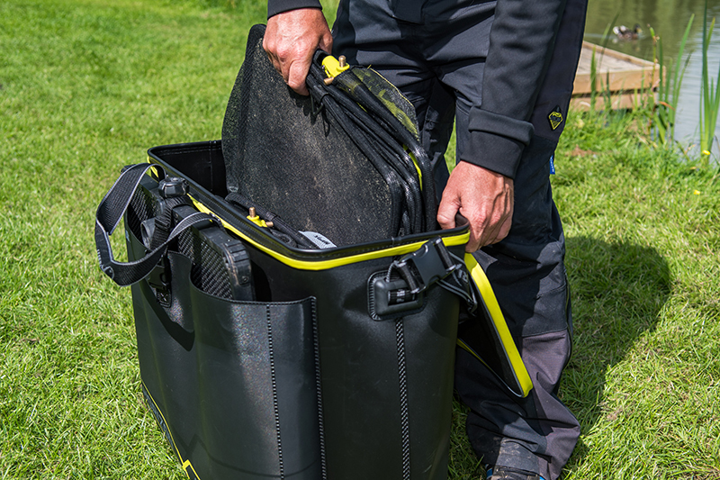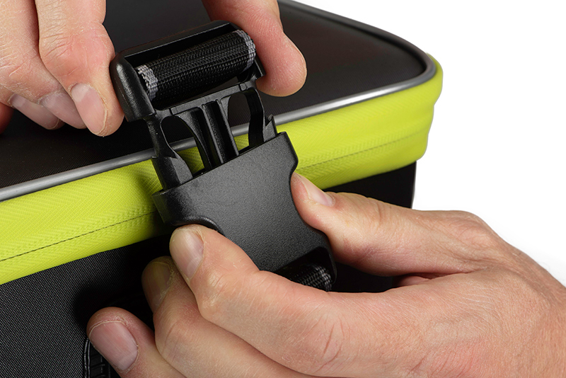 Horizon X EVA Multi Net Bag Large este o husa compacta fabricata integral din material EVA compozit, complet impermeabil si foarte rezistent la uzura, special conceputa pentru depozitarea minciogului sau a juvelnicului. Cusaturile etanse sudate termic sporesc rezistenta si durabilitatea gentii, impiedicand scurgerea accidentala a continutului si raspandirea mirosurilor neplacute (daca depozitati plasa de minciog uda). Husa se curata usor de murdarie si permite asezarea acesteia pe suprafete umede. Cureaua de umar reglabila si detasabila (prinderea clemelor de plastic este de tip Clip On) este captusita cu material buretat in zona centrala, pentru a evita ranirea umarului in timpul utilizarii. Compartimentul principal poate sustine fara probleme trei juvelnice sau capete de minciog. In plus, in partea din fata este pozitionat un buzunar special (63x6x40cm) pentru depozitarea tavilor laterale ale scaunelor modulare, sau chiar a sitelor de nada. Inchiderea compartimentului principal este ermetica, datorita fermoarului cu dublu sens invelit in material PU impermeabil. Manerele de transport din polyester pot fi prinse impreuna cu o banda de neopren (sistemul de prindere este cu banda velcro) moale si placut la atingere, ce nu raneste pielea palmei si asigura un confort ridicat in timpul utilizarii chiar daca geanta este complet incarcata si, prin urmare, grea.
