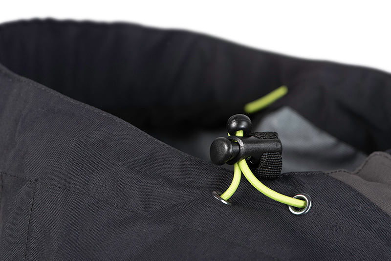 Geaca dispune de un guler inalt in zona gatului (cordon dublu pentru reglaj), ce confera protectie maxima impotriva vantului, impiedicand in acelasi timp patrunderea frigului la interior. Deflectorul interior si protectia tricotata pentru gat confera un confort sporit si pastreaza efieict caldura corporala. In partea inferioara gasim doua buzunare impermeabile pentru protectia mainilor impotriva frigului, ce se inchid cu fermoare YKK ce impiedica patrunderea apei. De cheitele fermoarelor sunt atasate snururi textile cu finisaj cauciucat ce ajuta la inchiderea/deschiderea facila a acestora. Buzunarul interior poate fi inchis complet, fiind recomandat pentru stocarea de obiecte personale: telefon, permis de pescuit, buletin, chei de masina etc. Gluga fixa prevazuta cu un cozoroc este partea integranta a gecii si se poate strange in jurul fetei cu ajutorul unui snur elasticat. Manecile gecii dispun de mansete din neopren elasticate, fixarea acestora fiind asigurata cu o banda velcro. O captuseala interioara din neopren asigura ca manseta ramane etansa la apa. Jacheta este conceputa pentru a fi combinata cu hanorace sau bluze de corp astfel incat sa poata fi parte a unui sistem de stratificare.
