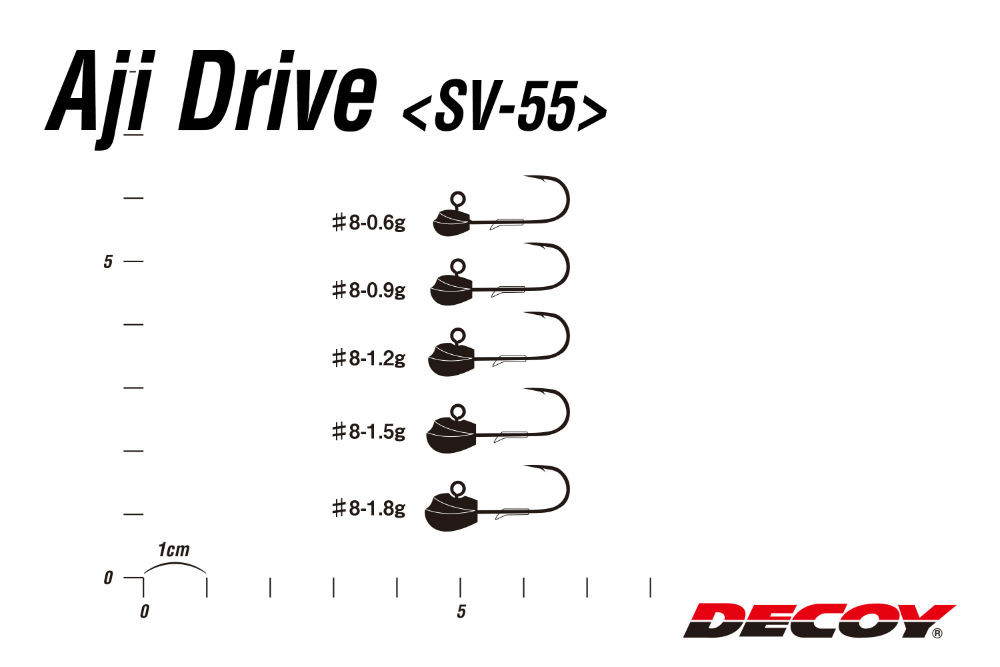Jigurile Decoy SV-55 Aji Drive sunt turnate pe carlige japoneze fabricate din otel carbon, ascutite cu o tehnologie chimica speciala care garanteaza un varf ascutit cu o putere mare de penetrare. SV-55 Aji Drive este un jig proiectat cu o atentie deosebita la detalii, fiind usor de adaptat in utilizarea cu fiecare greutate sau marime, oferind un efect weedless (pentru pescuitul in iarba si in locuri cu obstacole submerse), facilitand in acelasi timp efectul de intepare. Fiecare carlig este testat electronic individual si special conceput pentru naluci soft. Acest model de jig este potrivit pentru pescuitul cu naluci suple de tip shad sau grub, deoarece nu va afecta miscarea naturala de inot a unor astfel de momeli. Se foloseste la pescuitul tuturor pestilor rapitori atat in ape dulci, cat si in ape sarate.