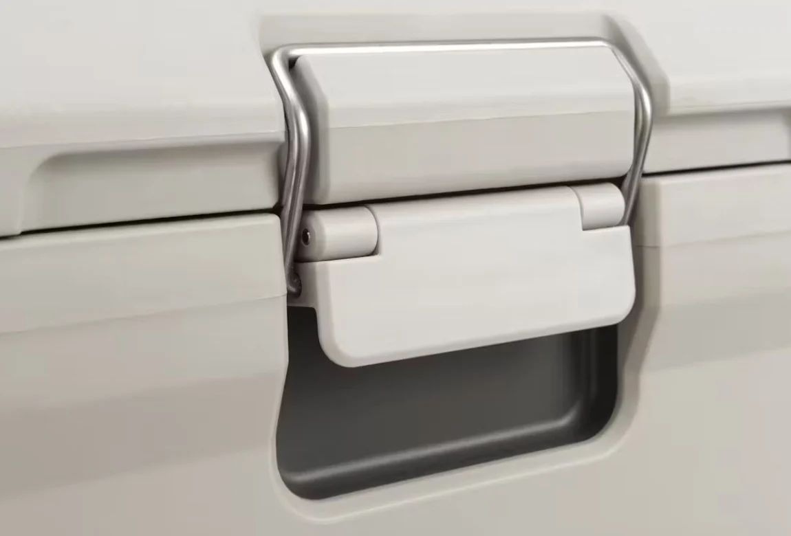 Constructia din plastic HDPE asigura rezistenta ridicata la utilizare frecventa in exterior, iar peretii si capacul extra grosi contribuie la o izolare eficienta. Sistemul metalic de inchidere permite deschiderea si inchiderea cu o singura mana, oferind acces rapid si usor la continut.