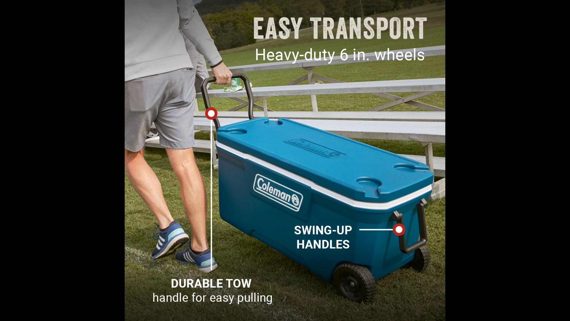 Cele doua roti supradimensionate faciliteaza transportul pe diferite tipuri de teren, iar manerul supradimensionat permite tractarea usoara a lazii. In plus, cele doua manere rabatabile ajuta la ridicare si incarcare, iar toate manerele se pliaza pentru depozitare compacta. Capacul izolat poate fi folosit ca scaun si sustine pana la 113kg, avand totodata 4 suporturi incastrate pentru bauturi. Orificiul de scurgere permite evacuarea lichidului fara inclinarea lazii, printr-un canal rezistent la rugina. Practic, este lada care cara recele dupa tine — chiar si cand terenul are alte planuri.