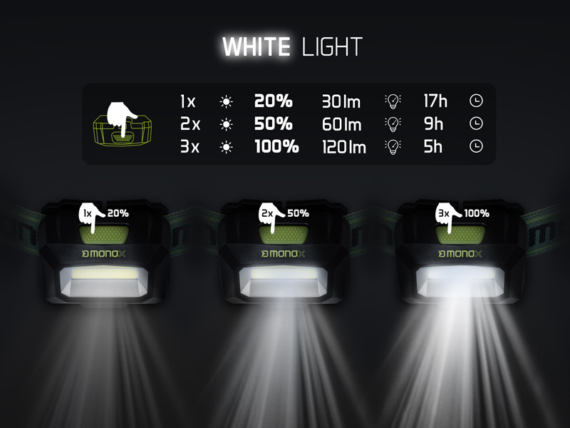 Echipată cu un bec LED de 3W, lanterna MONOX oferă o intensitate luminoasă de până la 120 de lumeni. Lumina albă are 3 trepte de intensitate – 20%, 50% și 100% – cu autonomie de până la 17 ore în modul economic. Lumina verde, ideală pentru păstrarea vizibilității nocturne fără a atrage insecte, dispune de 2 trepte de intensitate și autonomie de până la 40 de ore.