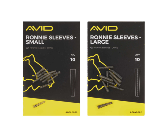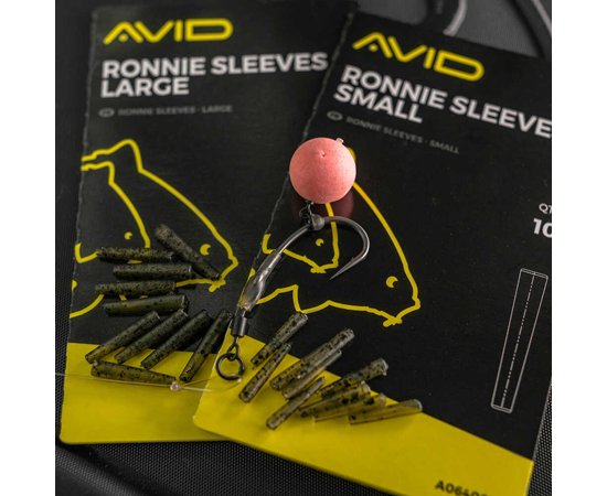 Mansonul Avid Carp Ronnie Sleeve este solutia cea mai facila pentru a fixa carligul in cadrul monturii Ronnie Rig. Avid Carp Ronnie Sleeve a fost proiectat in mod special pentru a aluneca usor pe carlig si pentru a-l fixa ireprosabil in agrafa. Varful conic creeaza un ansamblu foarte ingrijit, permitand in acelasi timp si refolosirea mansonului, proprietate ce lipseste in cazul utilizarii tubului termocontractil. Mansonul ofera versatilitate, putand fi folosit atat pentru a acoperi integral agrafa, cat si taiat pentru a oferi un grad de mobilitate suplimentar monturii, in cazul in care situatia o impune.Marimea Small este potrivita pentru carlig nr.8-6, iar marimea Large pentru carlig nr.4-1.
