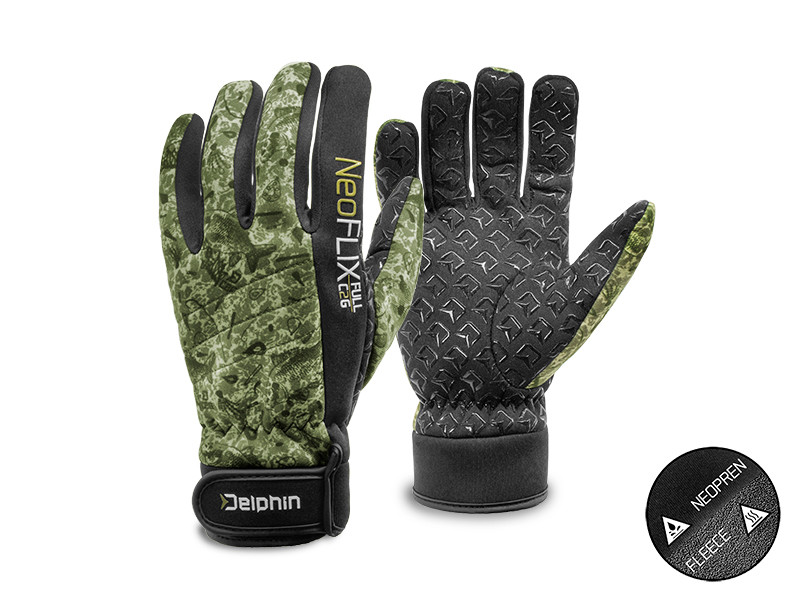 Delphin NeoFlix sunt mănuși confecționate din neopren de înaltă calitate, special concepute pentru a menține mâinile calde și uscate în timpul partidelor de pescuit sau al altor activități în aer liber. O noutate o reprezintă căptușeala din fleece (polar), ce sporește confortul termic la un nivel excepțional. În plus, în zona palmei este aplicat un material cauciucat foarte aderent, imprimat cu logo-ul Delphin, care facilitează priza inclusiv în condiții de umezeală.