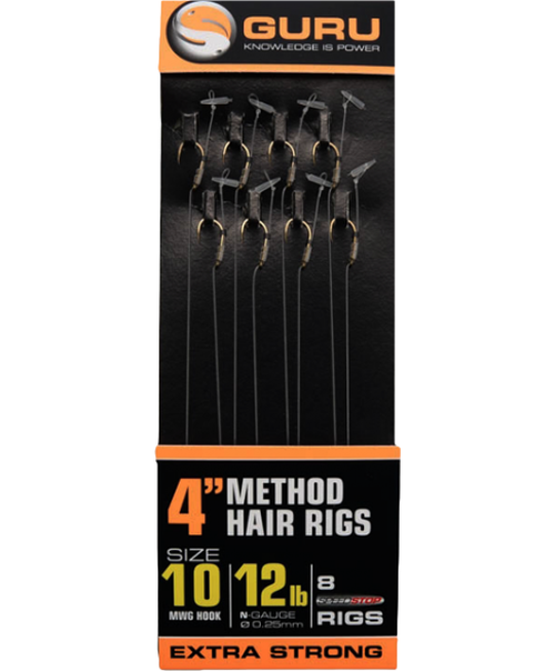 Guru Speedstop Method Hair Rigs sunt monturi gata legate, lungimea acestora fiind de 10cm. Firul folosit este monofilament N-Gauge iar carligele cu ochet sunt model MWG Barbless. Montura cu quick stopper este recomandata in pescuitul la method feeder cu momeli flotante (pop up, boabe de porumb din plastic, pelete soft etc). Pe un blister din carton sunt ambalate 8 monturi.
