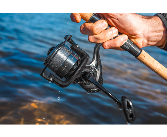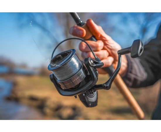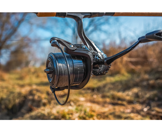 Mânerul CNC din aluminiu cu buton de cauciuc asigură o prindere sigură și confortabilă chiar și în condiții de umezeală. Mulineta are o greutate optimă pentru un feeder solid (410g), fiind potrivită pentru partide lungi fără disconfort în utilizare.