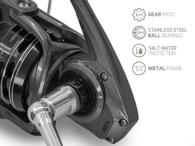 IROX este construita pe baza unui corp metalic solid, cu ax central din otel inoxidabil si 11 rulmenti din inox pentru o functionare lina si o viata lunga. Manivela metalica cu knob mare cauciucat se fixeaza prin tehnologia screw-in, eliminand jocul nedorit si asigurand confort la manevrare.