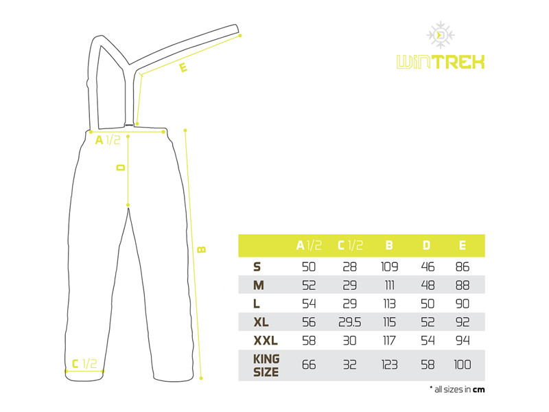 Pantalonii WinTREK sunt echipati cu buzunare cu fermoar pe ambele parti, cu fermoarele cusute in material galben stralucitor, oferind atat o estetica deosebita, cat si protectie impotriva umezelii datorita benzilor impermeabile. Talia pantalonilor este prevazuta cu bretele elastice reglabile, care pot fi ajustate in functie de inaltimea dumneavoastra si sunt complet detasabile cu ajutorul unor benzi Velcro. In plus, talia pantalonilor are o banda elastica integrata, care ofera o flexibilitate sporita si o potrivire optima pe corp. Partea interioara a pantalonilor este realizata dintr-un material matlasat neted, ceea ce ii face extrem de confortabili la purtare si usor de imbracat.