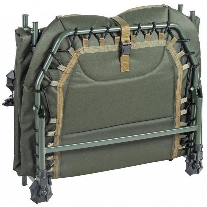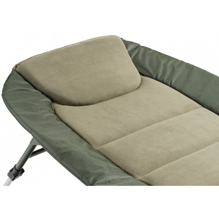 Stabilitatea supremă este garantată de cele 8 picioare telescopice dotate cu talpici anti-noroi și sistem individual de inclinare, permițând ajustarea perfectă pe terenuri denivelate sau moi. Salteaua anatomică, confecționată din nylon B-POL 600D extrem de rezistent și ușor de curățat, își păstrează forma și confortul. Un plus de confort este adus de perna moale căptușită cu fleece în zona capului.