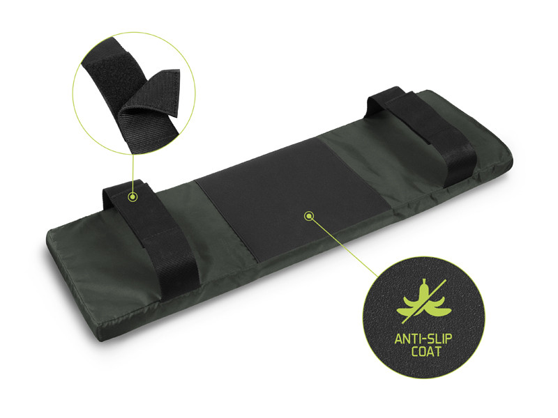 Pe partea din dos se găseşte o suprafaţă antialunecare din cauciuc care asigură o aderenţă perfectă la suprafaţa băncuţei. Două chingi cu scai permit fixarea rapidă de orice băncuţă standard a bărcii.