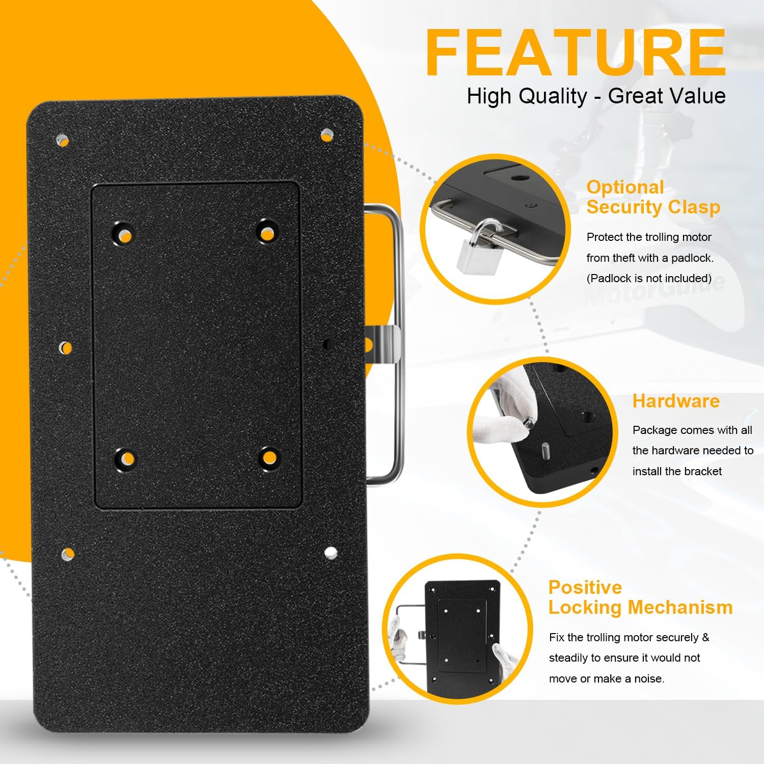 MotorGuide Xi Series Quick Release Bracket este un suport dedicat pentru asamblarea si demontarea rapida a motoarelor MotorGuide si Minn kota pe barcile de pescuit.