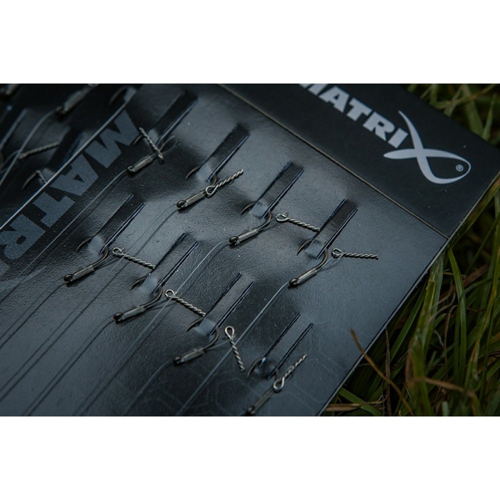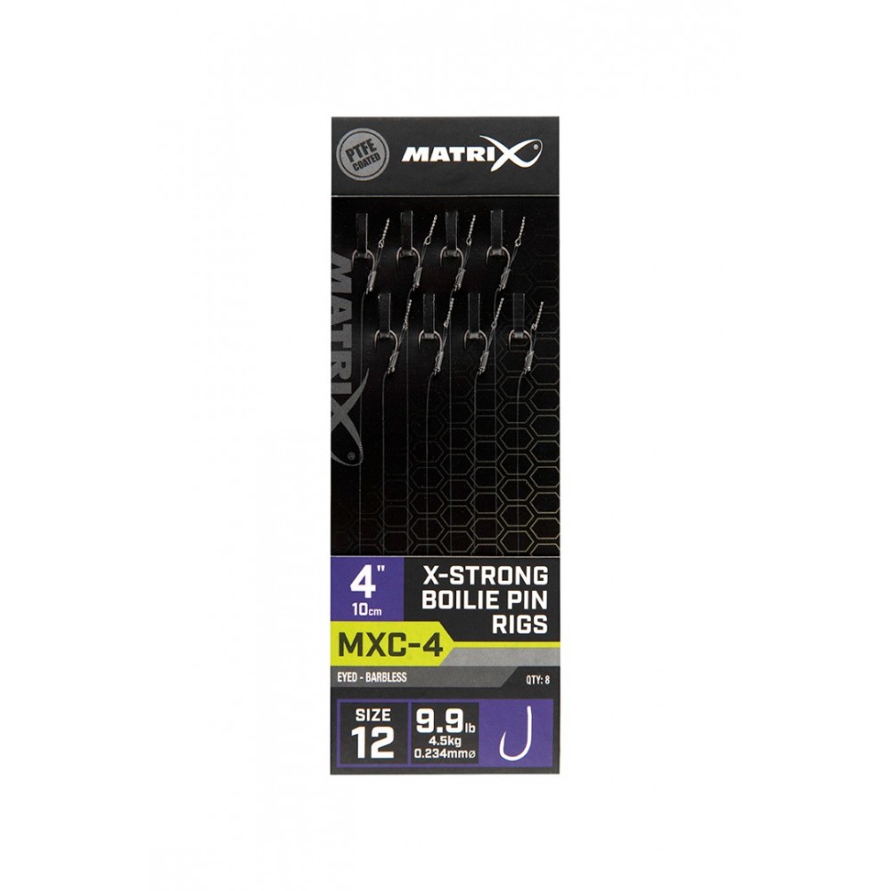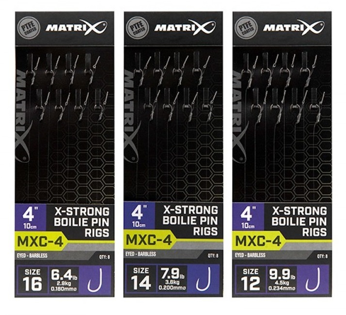 Noile rigurile MXC-4 de la MATRIX sunt proiectate pentru a fi folosite in pescuitul la feeder si pentru a oferi rezistenta necesara finalizarii drillurilor cu pestii de talie mare. Rigurile sunt confectionate pornind de la carligele MXC-4 cu tija deschidere larga, fiind acoperite cu un strat special PTFE. In plus, sunt prevazute cu spin rezistent la uzura Matrix Boilie Pin. Acestea dispun de o lungime masurata cu precizie la 4 inci (10cm) pentru a putea fi depozitate perfect in penarele Matrix.
