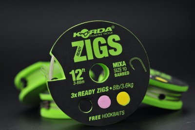 Korda Ready Zigs Barbed sunt riguri special concepute pentru pescuitul la crap, pregatite din fabrica pentru a economisi timp pe mal. Carligele Mixa nr.10, prevazute cu barbeta, sunt legate cu fir monofilament de 8lbs, optimizat pentru prezentari eficiente intre ape.