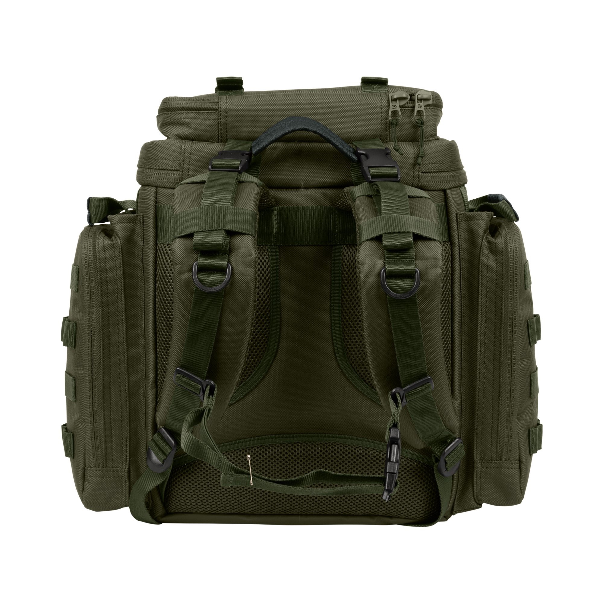 Lateralele sunt echipate cu bucle elastice si chingi, utile pentru transportul bankstick-urilor sau altor unelte. In total, rucsacul ofera 6 puncte elastice de fixare exterioara, astfel incat unealta necesara sa fie mereu la indemana. Curelele reglabile din partea superioara permit prinderea unor accesorii suplimentare, in functie de stilul si nevoile pescarului.