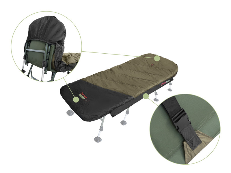 Un detaliu important al acestui sac de dormit este sistemul de fixare, care include niște mâneci speciale la ambele capete ale sacului și o curea robustă cu cataramă, menținând sacul ferm atașat de patul de pescuit, indiferent de cât de mult te miști în somn. Fermoarul principal, amplasat pe ambele părți ale sacului, este mare și robust, ușor de deschis chiar și când te grăbești să răspunzi la o trăsătură. Pe lângă fermoarele principale, fiecare strat suplimentar are câte un fermoar mai mic, ca să nu deranjeze, astfel încât să poți ajusta grosimea sacului de dormit în funcție de temperatura exterioară și preferințele personale.