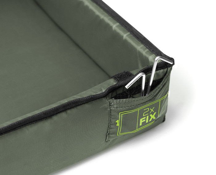 DOUMAT înseamnă şi faptul, că această saltea o putem folosi şi ca o saltea standard fără margini, sau că putem ridica şi fixa aceste margini cu ajutorul scai-urilor care se găsesc în fiecare colţ. Aşa apare o saltea mai sigură cu margini ridicate care reuşeşte să împiedice ca, captura dumneavoastră să ajungă în afara saltelei şi să se rănească. Salteaua este echipată cu doi ţăruşi metalici şi ochiuri cusute care servesc la fixarea de sol pe vremea cu vânt. Pentru aceşti ţăruşi a fost dezvoltată o husă mai mică şi în acest caz sunt întotdeauna la îndemână. Salteaua este confecţionată din material cu uscare rapidă care se poate curăţa simplu.