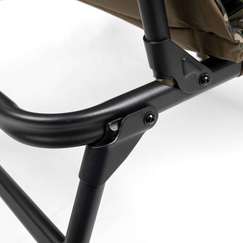 Cotierele sunt acoperite cu neopren moale, oferind o suprafață plăcută la atingere și mai multă stabilitate în poziționare. Banda cu Velcro integrată permite atașarea scaunului de patul de pescuit, ideal pentru cei care folosesc setup complet în sesiunile de crap.