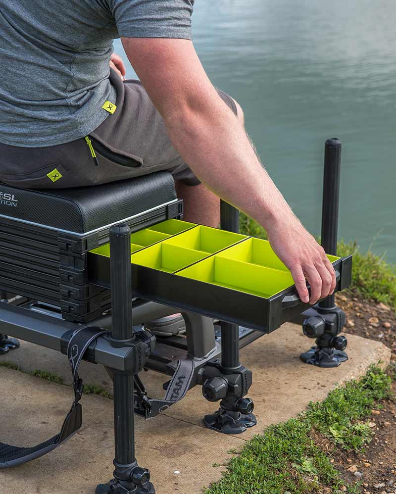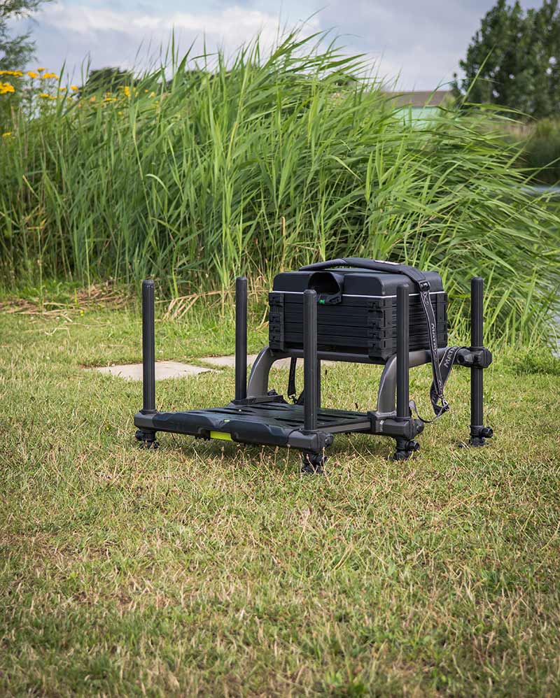 Cadrul mai scurt permite eliminarea unor tavite si pozitionarea sezutului mai jos, cu o inaltime minima de 350 mm, ceea ce il face ideal pentru pescarii mai scunzi sau pentru cei care prefera o pozitie ergonomica la mal. Sertarele laterale si cele doua sertare cu adancime mica ofera spatiu eficient de depozitare pentru accesorii.